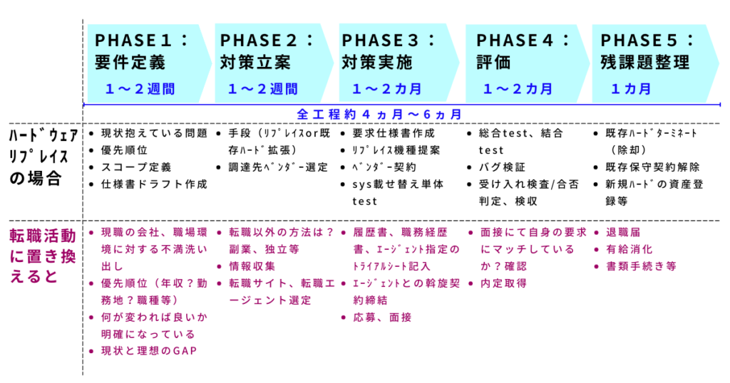 転職活動を5つのフェーズに分けて考えてみると業務のプロジェクトとあまり変わらず、要件を定義しどのような対策をどこに打つのか明確になる。