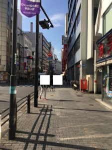 西口を背にして右手方面に進みます。写真の通り、ドラッグストアに向かうイメージです。「薬」の看板が目印です。
