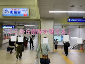 中央改札を出て東口側(高島屋側)に歩いて行くと突き当たり(コージーコーナーがあるとこ)を右に曲がります。右手にはスタバに行けるエスカレーターが、ありますよね。
