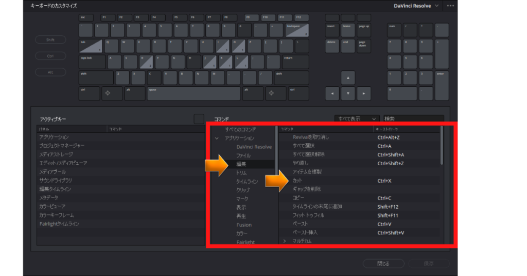 次に、ショートカットです。例えばタイムライン上でプレイヘッドを合わせて「ハサミ」ボタンを押すのをショートカットで使う場合等、自分が使い慣れているキーを割り当てる事が可能です。